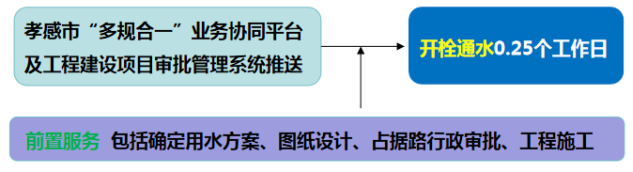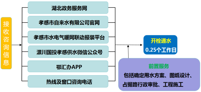 流程說明:供水企業(yè)通過孝感市“多規(guī)合一”業(yè)務(wù)協(xié)同平臺(tái)及工程建設(shè)項(xiàng)目審批管理系統(tǒng)推送獲取項(xiàng)目建設(shè)信息后主動(dòng)對(duì)接,先行開展確定用水方案、圖紙?jiān)O(shè)計(jì)、工程施工等服務(wù),辦理用水工程涉及的占道、掘路、占用綠地、伐移樹木等相關(guān)行政審批手續(xù),提前完成外線工程實(shí)施,為客戶提供“無感免申請(qǐng)”服務(wù)。客戶需要用水時(shí),0.25個(gè)工作日內(nèi)開栓通水。