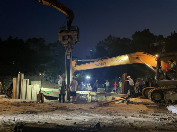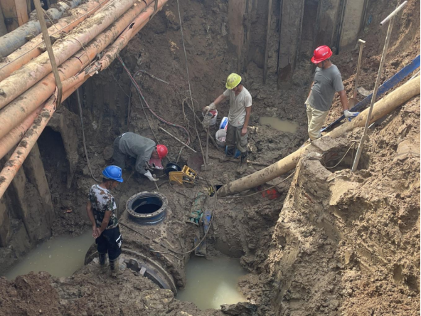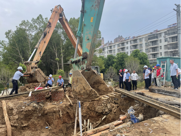 晚上9點,公司第一時間派出10余名搶修人員迅速到場關閘止水,三水廠暫停供水。與此同時,技術人員、施工人員和設備設施“跑步前進”、同步到場,對破損溢水點進行邊開挖、邊診斷。由于情況復雜,晚上24點,3臺大型挖機、樁機進場,20余人到場增援,清理作業(yè)面。市政府組織市住建局、澴川國投、供電公司、燃氣公司即刻組成技術專班,會同公司技術人員和一線工人現(xiàn)場制定搶修方案。