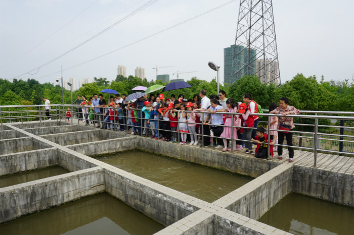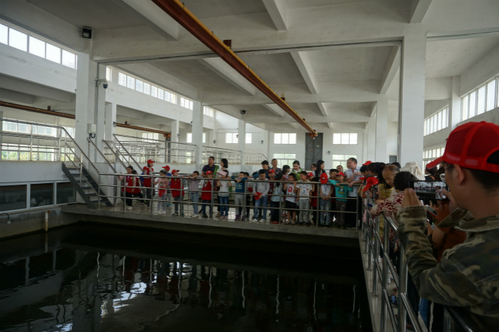 小記者們都是第一次走進(jìn)水廠,對每道生產(chǎn)流程都非常好奇,對每件處理設(shè)施都饒有興趣,一路走一路七嘴八舌地詢問;三水廠工作人員則結(jié)合水處理流程和工作原理,用淺顯而生動的語言為他們一一講解說明,耐心細(xì)致地解答著每一個提問。在反應(yīng)沉淀池上,小記者們看到了渾濁的源水由兩根巨大輸水管道輸送到絮凝反應(yīng)池里,當(dāng)他們得知這里的源水都是來自34公里以外的漢江時,不由得咋舌驚嘆“原來我們每天喝的自來水需要輸送那么遠(yuǎn)的距離啊,真是太不容易了!”